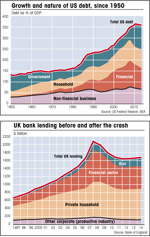 Because of internationally agreed accounting rules, banks actually add to GDP when they make loans, regardless of where the loan is going. This explains why nations with big banking sectors, such as Britain, have relatively strong GDP figures even though, with 80% of the economy based on services, they don’t produce much anymore. Our prosperity is a debt-based illusion.